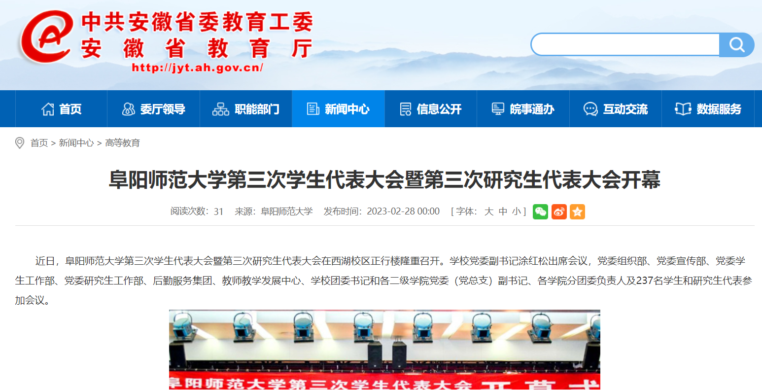 2月28日,安徽教育网报道:阜阳师范大学第三次学生代表大会暨第三次研究生代表大会开幕。文章地址: