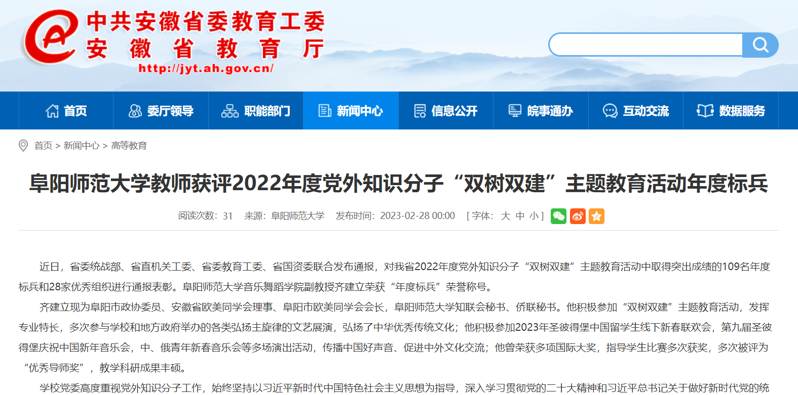 2月28日,安徽教育网报道:阜阳师范大学教师获评2022年度党外知识分子“双树双建”主题教育活动年度标兵。文章地址:http://jyt.ah.gov.cn/xwzx/gdjy/40633804.html