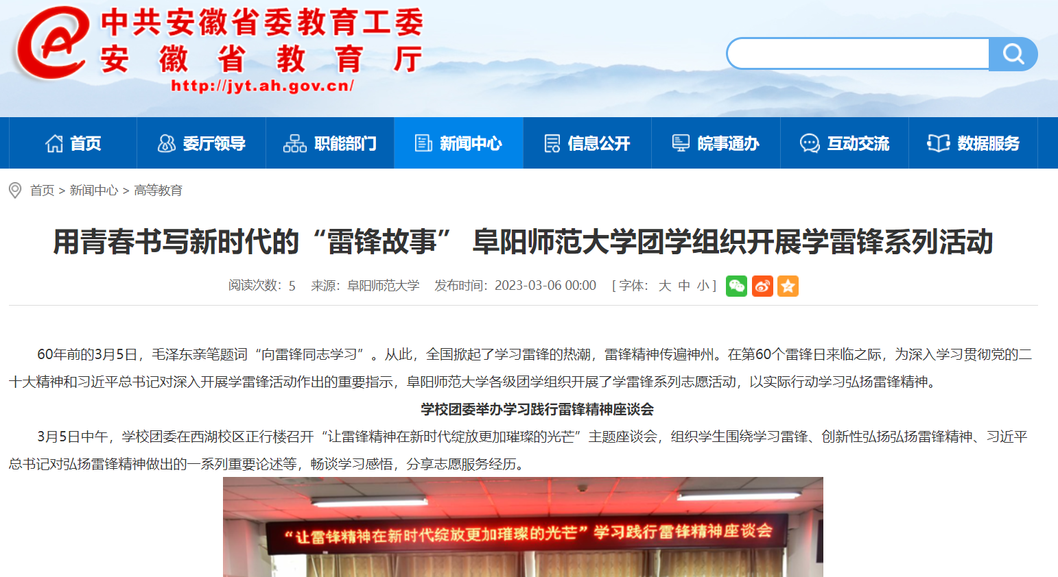 3月06日,安徽教育网报道:用青春书写新时代的“雷锋故事” 阜阳师范大学团学组织开展学雷锋系列活动。文章地址: