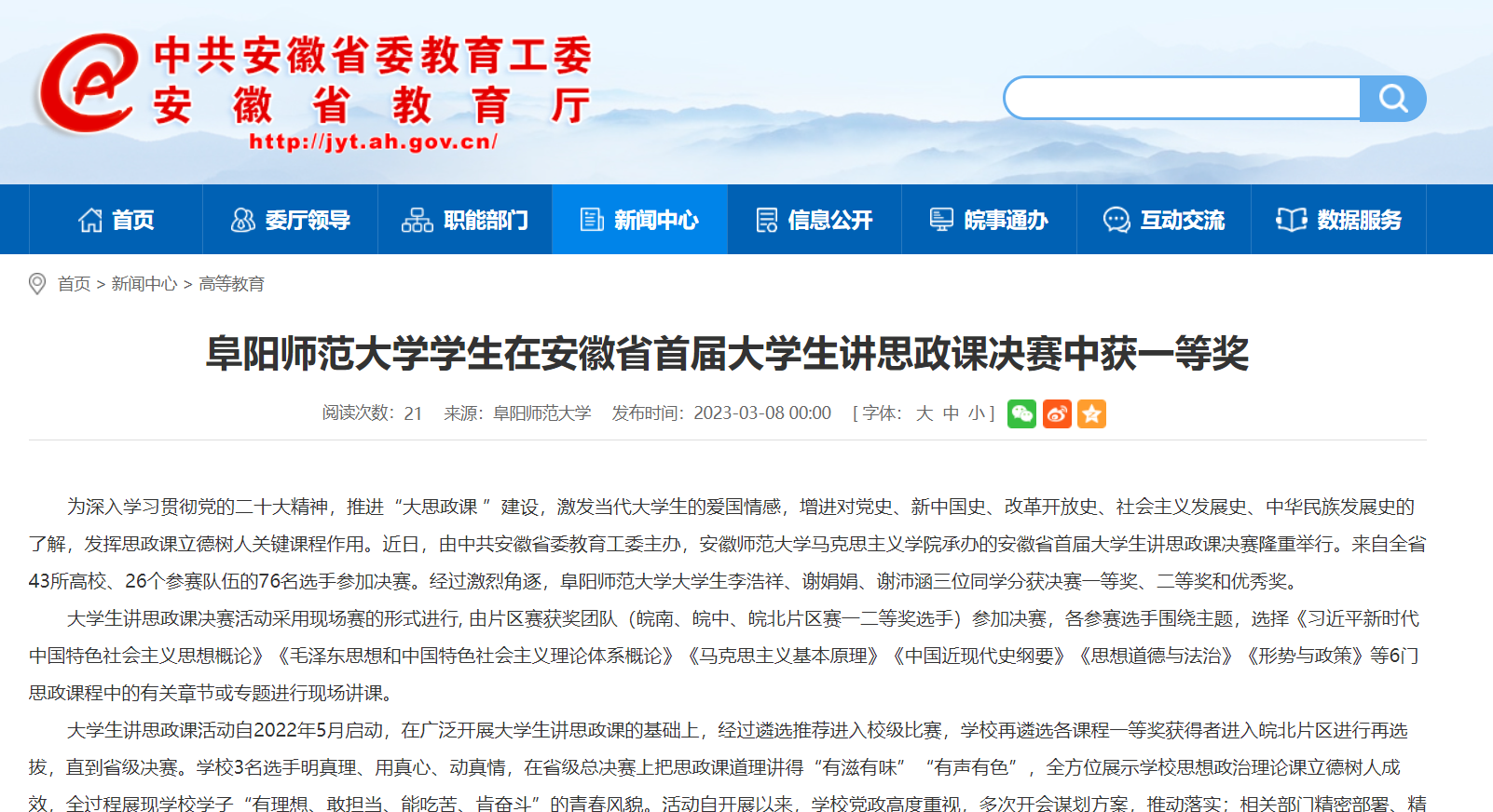 3月08日,安徽教育网报道:阜阳师范大学学生在安徽省首届大学生讲思政课决赛中获一等奖。文章地址: