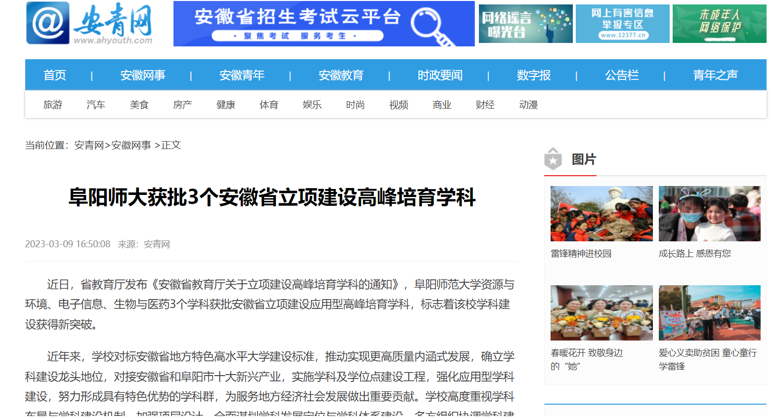 3月09日,安青网报道:阜阳师大获批3个安徽省立项建设高峰培育学科。文章地址: