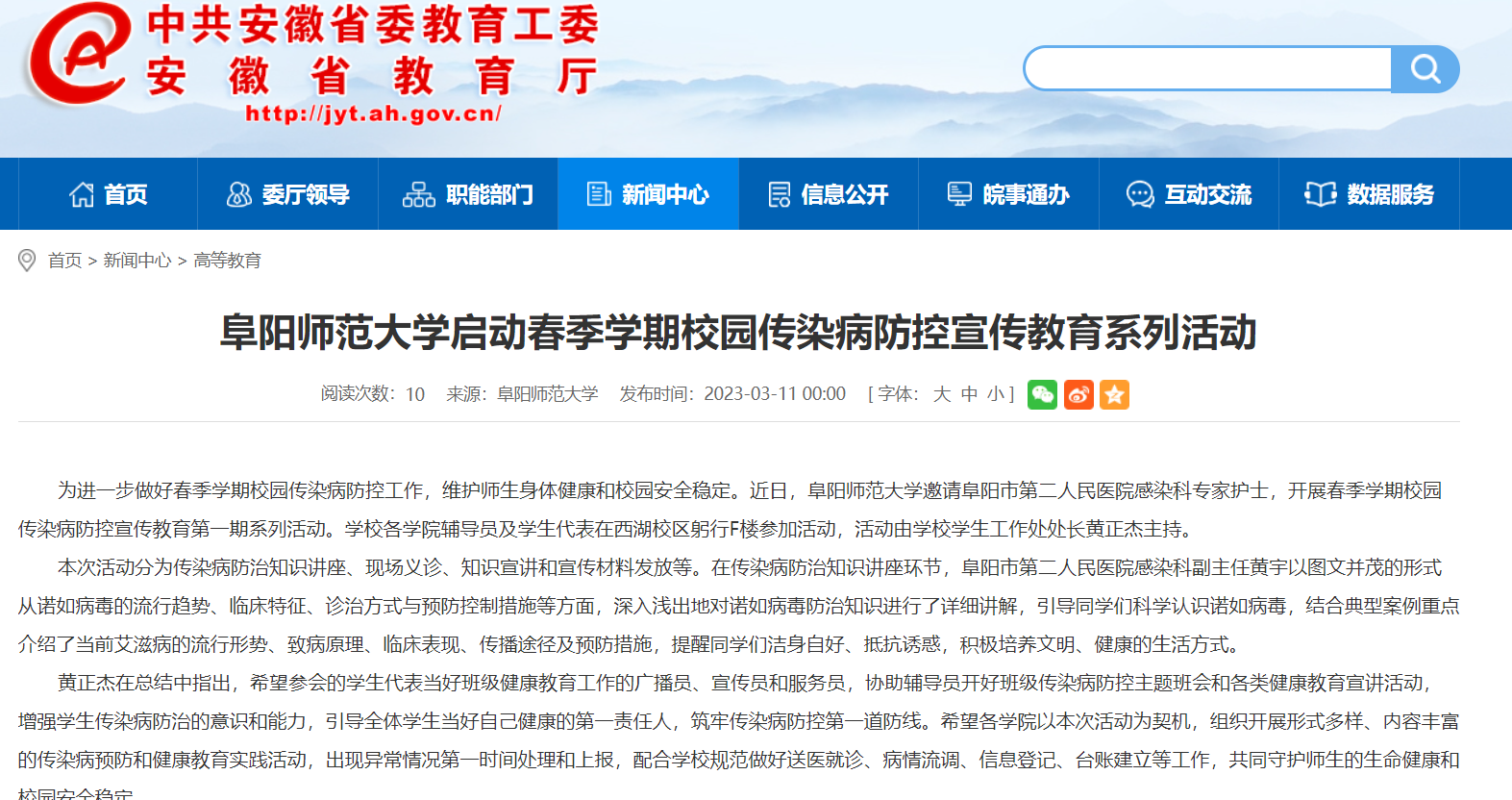 3月11日,安徽教育网报道:阜阳师范大学启动春季学期校园传染病防控宣传教育系列活动。文章地址:
