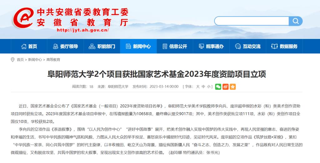 3月14日,安徽教育网报道:阜阳师范大学2个项目获批国家艺术基金2023年度资助项目立项。文章地址: