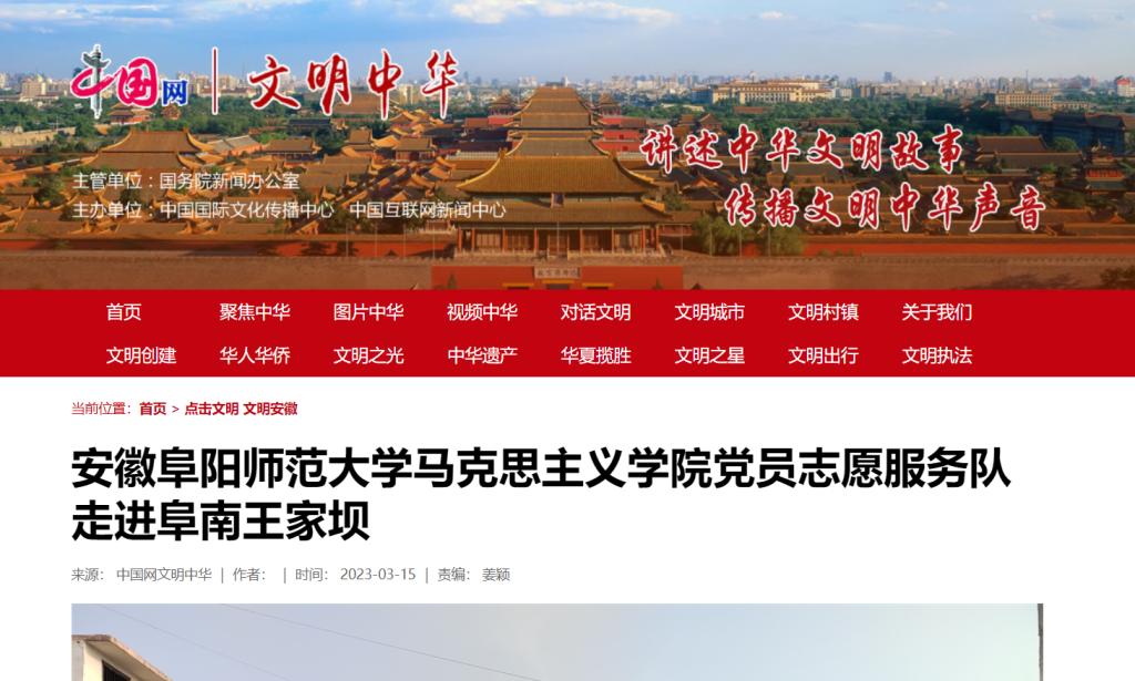 3月15日,中国网报道:安徽阜阳师范大学马克思主义学院党员志愿服务队走进阜南王家坝。文章地址:http://wmzh.china.com.cn/2023-03/15/content_42295092.htm