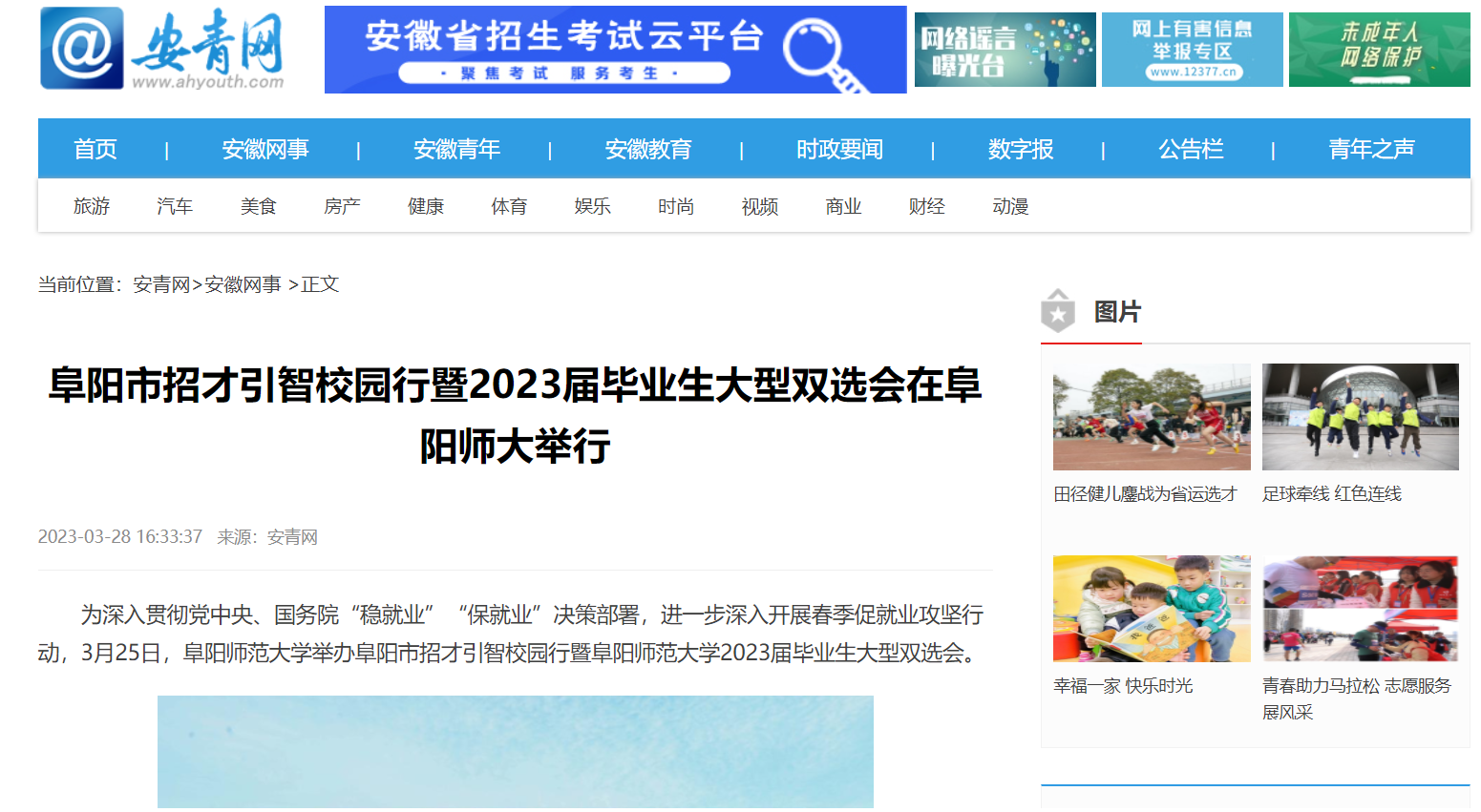 3月28日,安青网报道:阜阳市招才引智校园行暨2023届毕业生大型双选会在阜阳师大举行。文章地址: