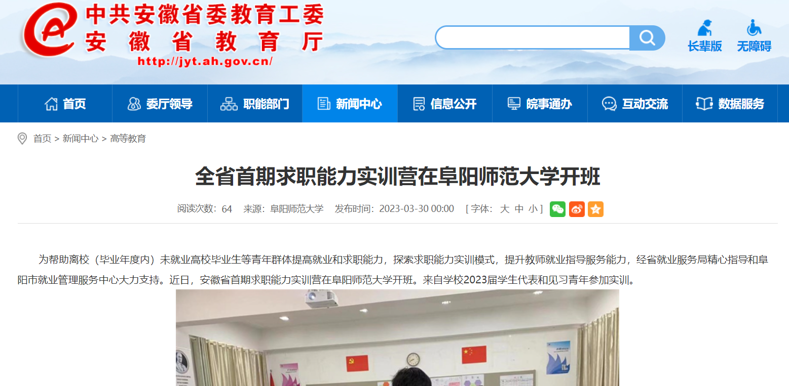 3月30日,安徽教育网报道:全省首期求职能力实训营在阜阳师范大学开班。文章地址: