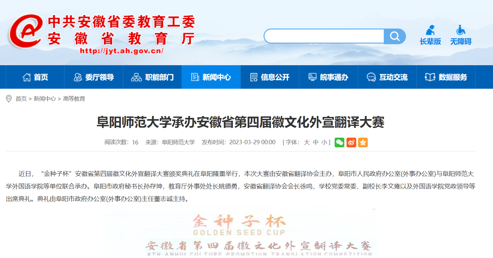 3月29日,安徽教育网报道:阜阳师范大学承办安徽省第四届徽文化外宣翻译大赛。文章地址: