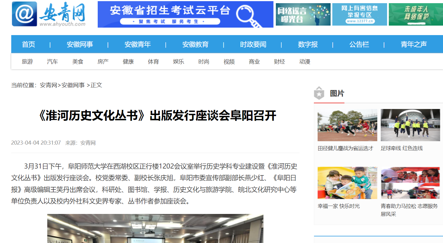 4月04日,安青网报道:《淮河历史文化丛书》出版发行座谈会阜阳召开。文章地址: