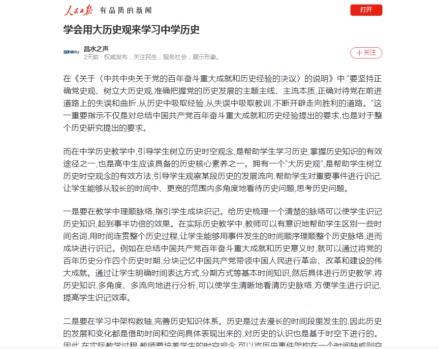 4月5日,人民日报客户端转载我校历史与文化旅游学院学生挑战杯项目研究成果:《学会用大历史观来学习中学历史》。文章地址:https://wap.peopleapp.com/article/rmh34876027/rmh34876027