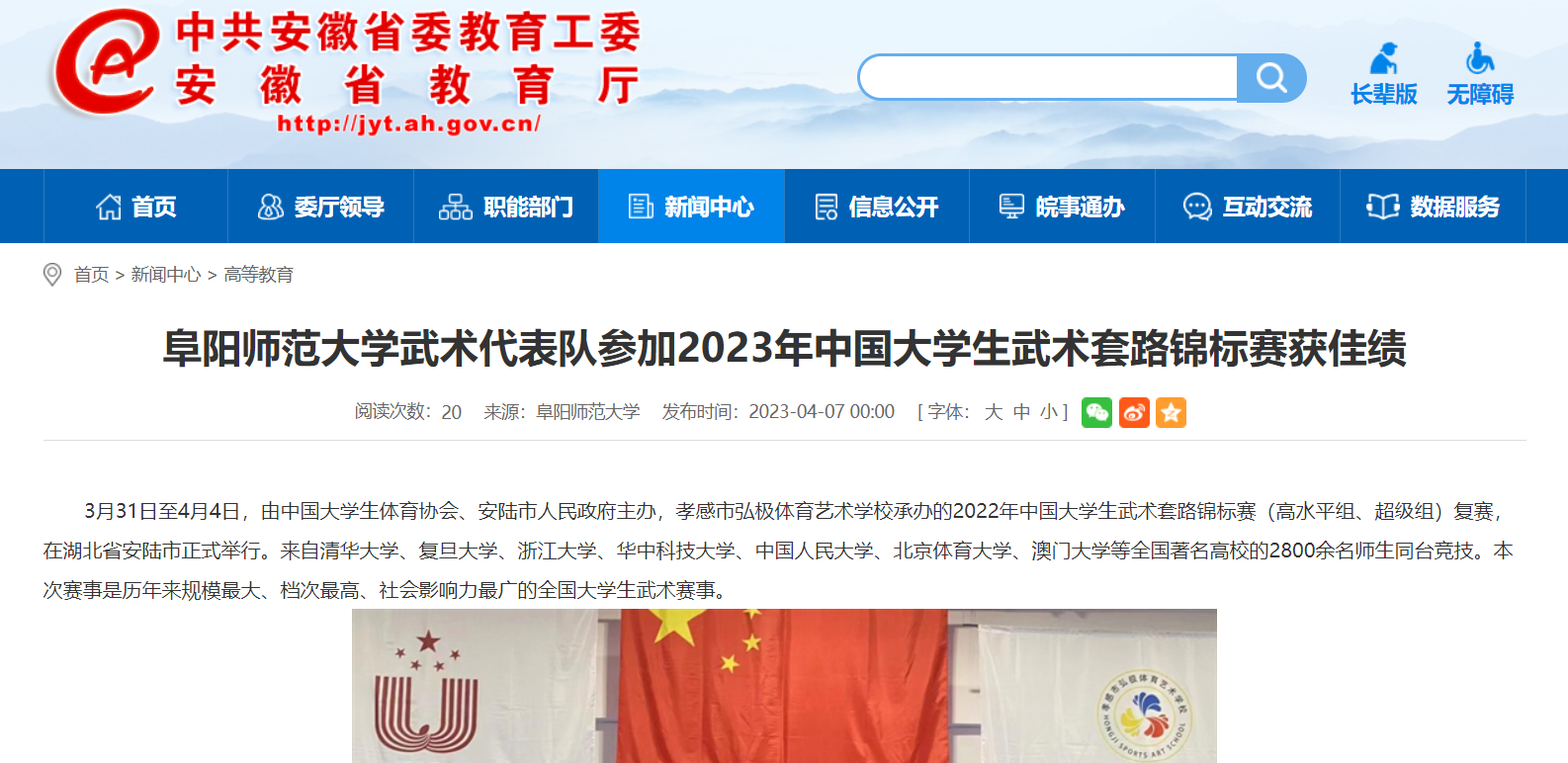 4月07日,安徽教育网报道:阜阳师范大学武术代表队参加2023年中国大学生武术套路锦标赛获佳绩。文章地址: