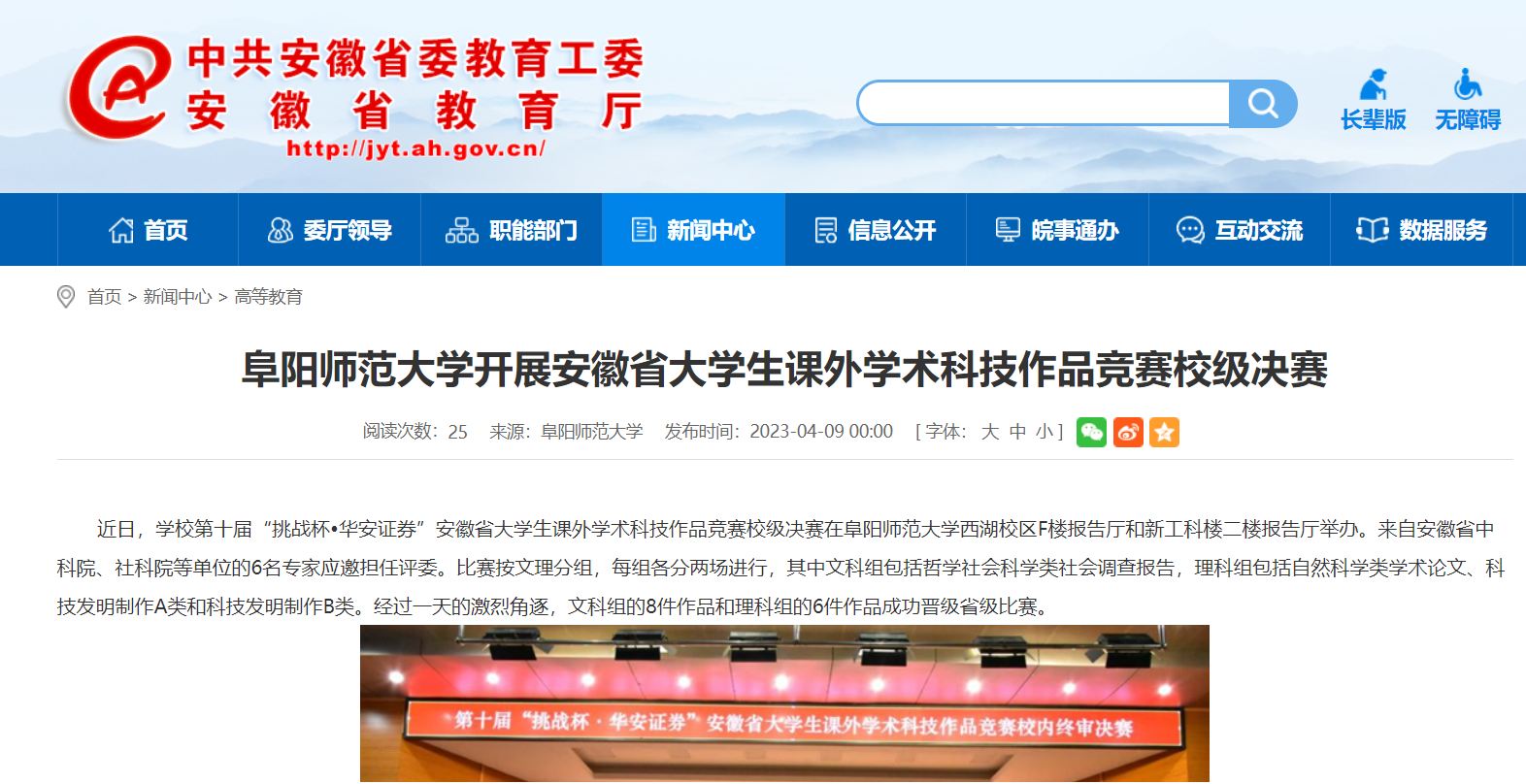 4月09日,安徽教育网报道:阜阳师范大学开展安徽省大学生课外学术科技作品竞赛校级决赛。文章地址: