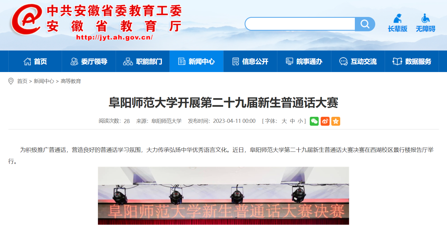 4月11日,安徽教育网报道:阜阳师范大学开展第二十九届新生普通话大赛。文章地址: