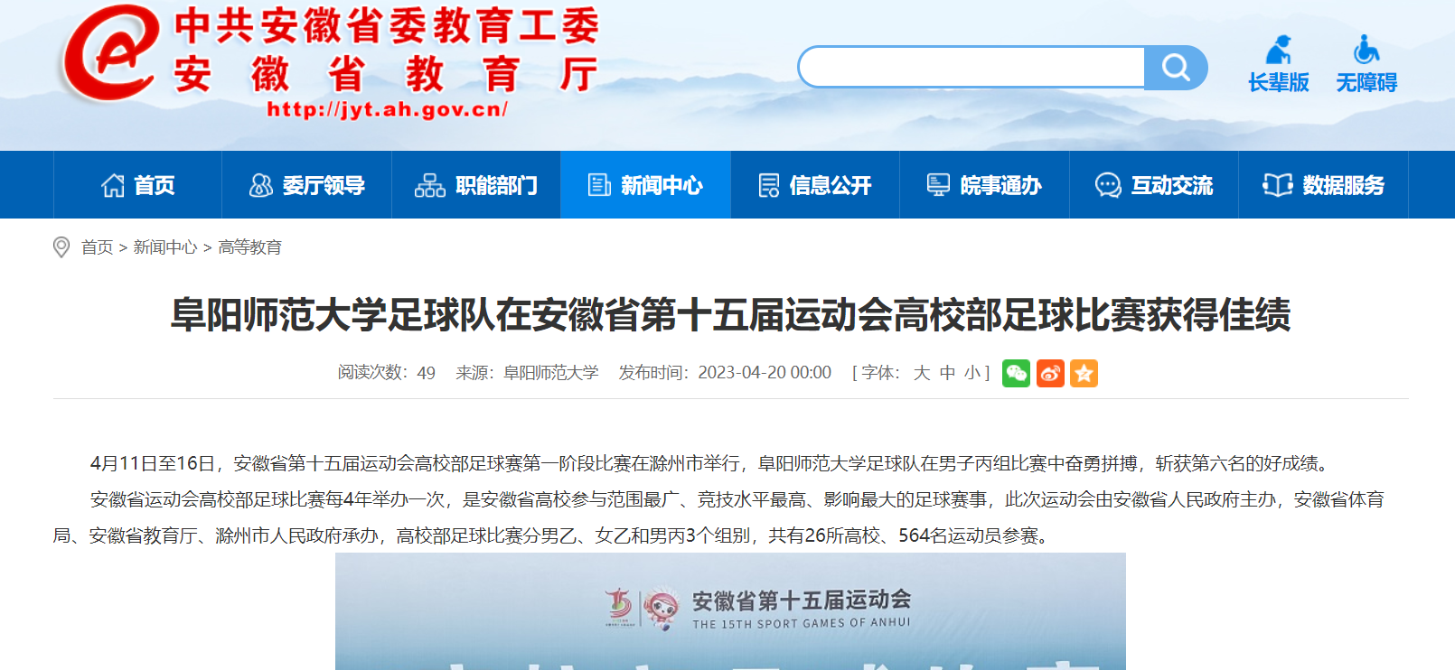 4月20日,安徽教育网报道:阜阳师范大学足球队在安徽省第十五届运动会高校部足球比赛获得佳绩。文章地址: