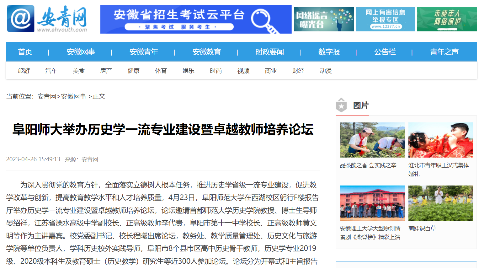 4月26日,安青网报道:阜阳师大举办历史学一流专业建设暨卓越教师培养论坛。文章地址: