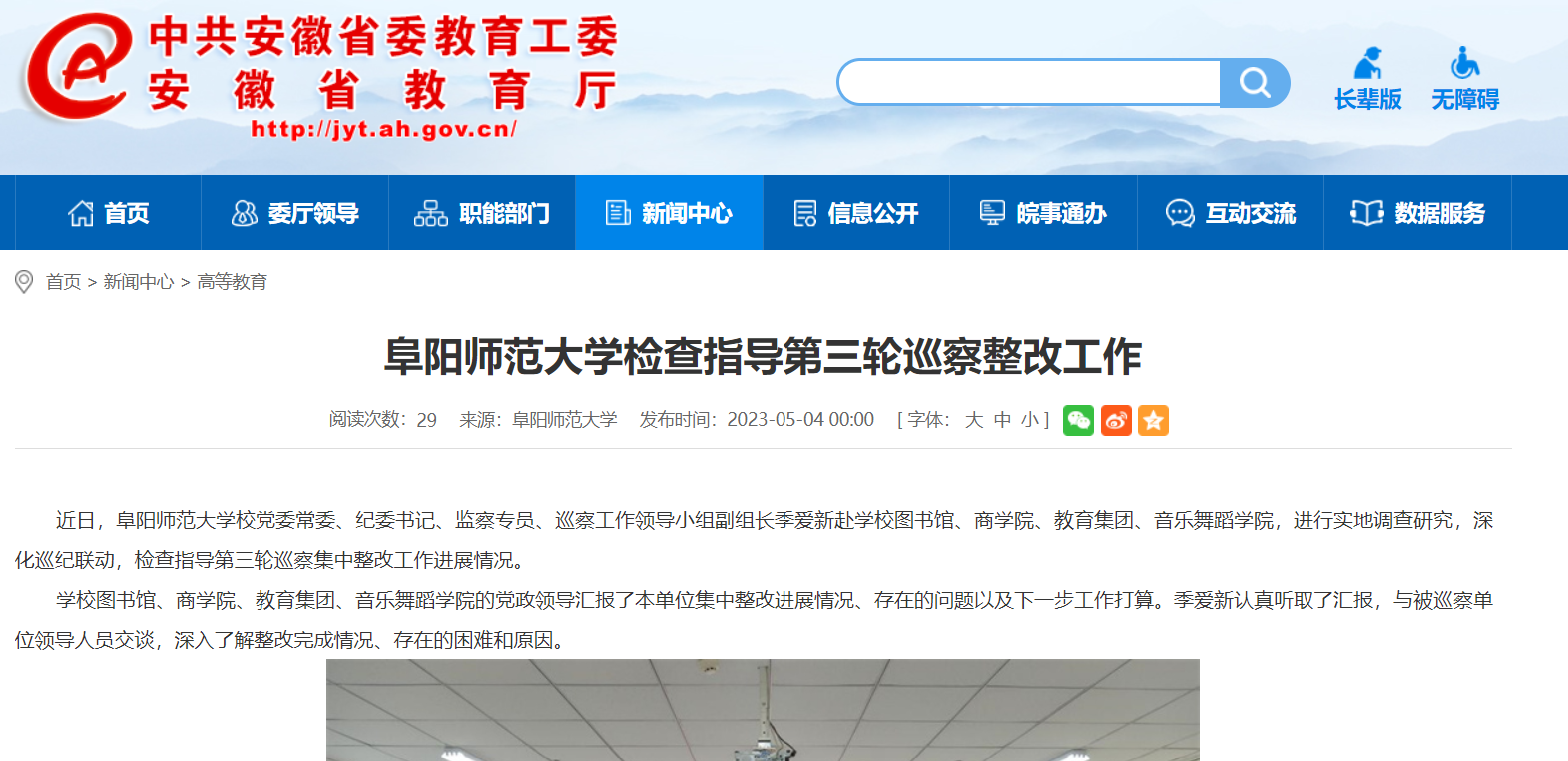 5月04日,安徽教育网报道:阜阳师范大学检查指导第三轮巡察整改工作。文章地址: