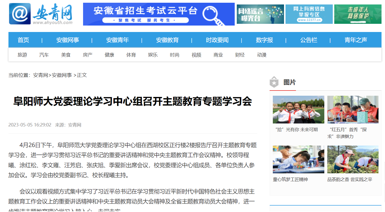 5月05日,安青网报道:阜阳师大党委理论学习中心组召开主题教育专题学习会。文章地址:
