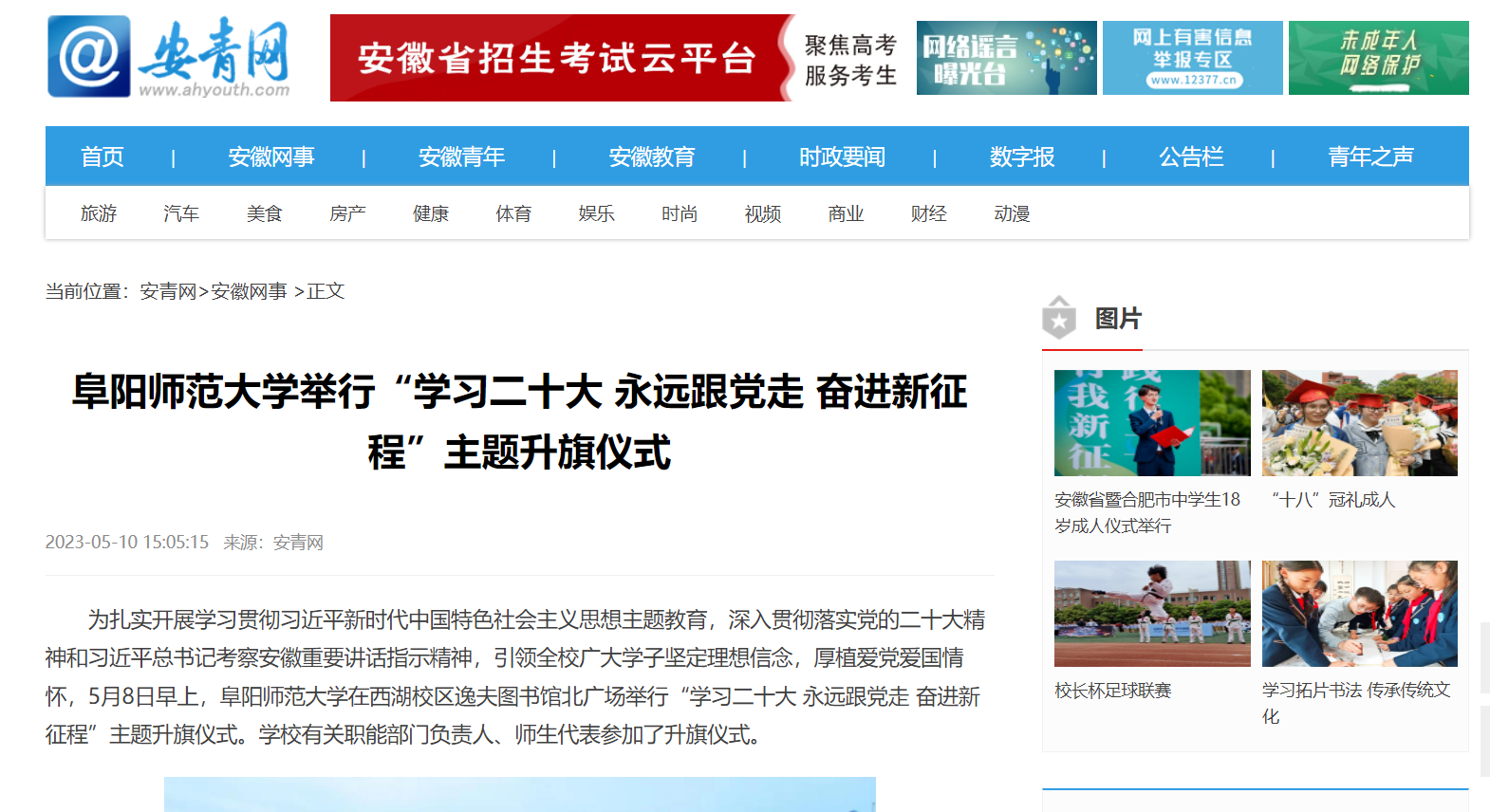 5月10日,安青网报道:阜阳师范大学举行“学习二十大 永远跟党走 奋进新征程”主题升旗仪式。文章地址:http://www.ahyouth.com/news/20230510/1685423.shtml