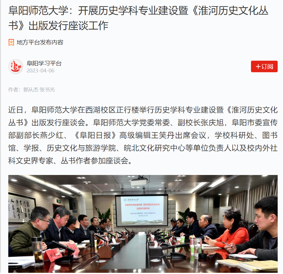 4月06日,“学习强国”阜阳学习平台报道:阜阳师范大学:开展历史学科专业建设暨《淮河历史文化丛书》出版发行座谈工作。文章地址:https://article.xuexi.cn/articles/index.html?art_id=6703882585047303227&cdn=https%3A%2F%2Fregion-anhui-resource&item_id=6703882585047303227&study_style_id=feeds_opaque&t=1680772227588&showmenu=false&ref_read_id=d2908e68-9f59-43eb-b7d0-605b116487fc&pid=&ptype=-1&source=share&share_to=wx_single