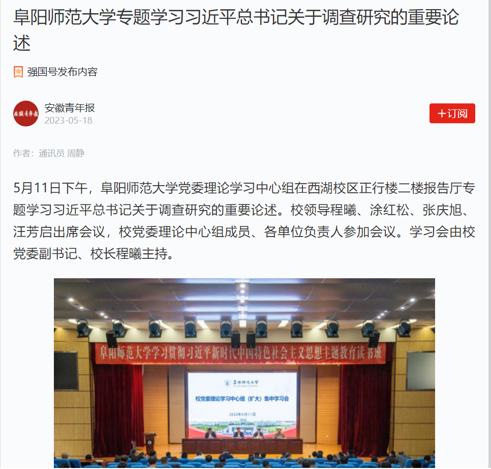 5月18日,“学习强国”安徽青年报平台报道:阜阳师范大学专题学习习近平总书记关于调查研究的重要论述。文章地址:https://article.xuexi.cn/articles/index.html?art_id=5874679738895178543&source=share&study_style_id=feeds_opaque&reco_id=102301f5811fc0a82234000i&share_to=wx_single&study_share_enable=1&study_comment_disable=0&ptype=0&item_id=5874679738895178543