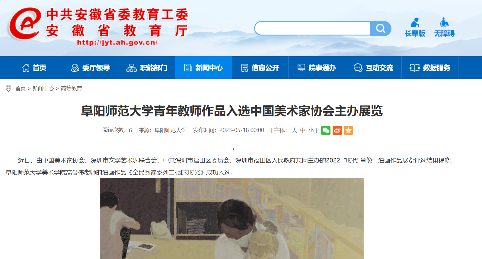 5月18日,安徽教育网报道:阜阳师范大学青年教师作品入选中国美术家协会主办展览。文章地址: