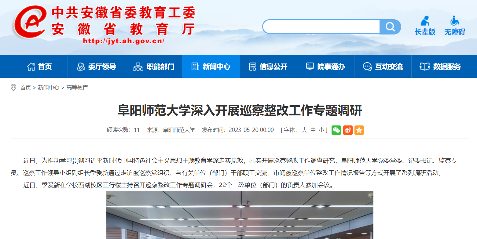 5月20日,安徽教育网报道:阜阳师范大学深入开展巡察整改工作专题调研。文章地址:
