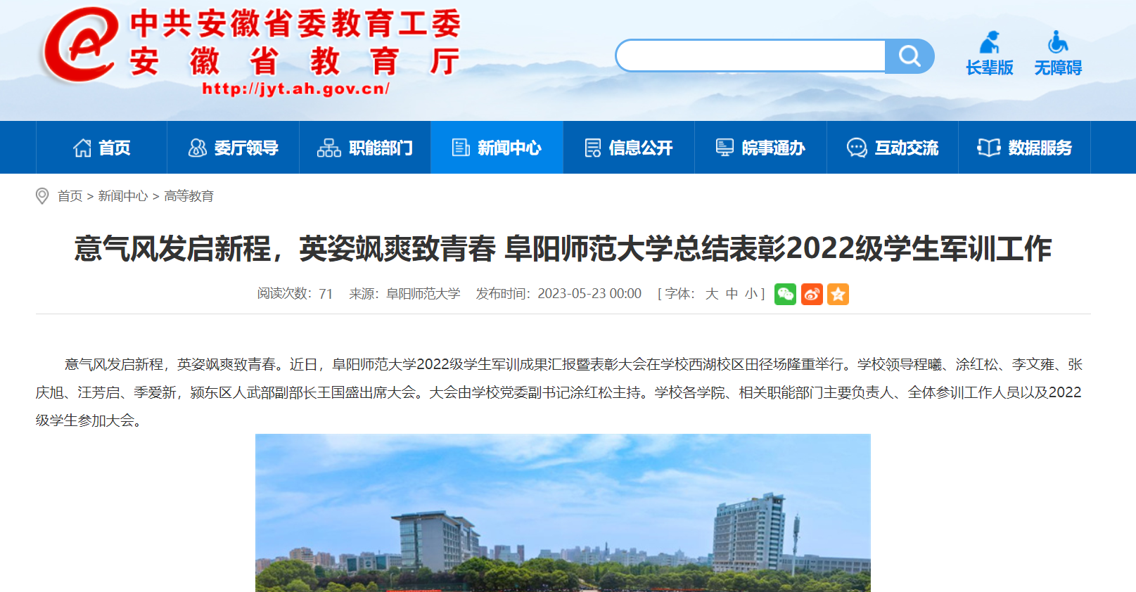 5月23日,安徽教育网报道:意气风发启新程,英姿飒爽致青春 阜阳师范大学总结表彰2022级学生军训工作。文章地址:http://jyt.ah.gov.cn/xwzx/gdjy/40651307.html