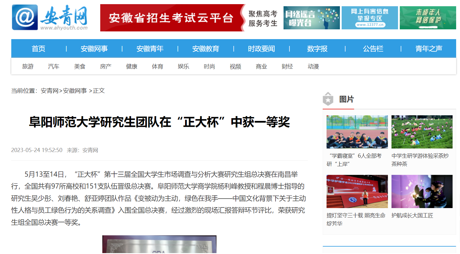 5月24日,安青网报道:阜阳师范大学研究生团队在“正大杯”中获一等奖。文章地址: