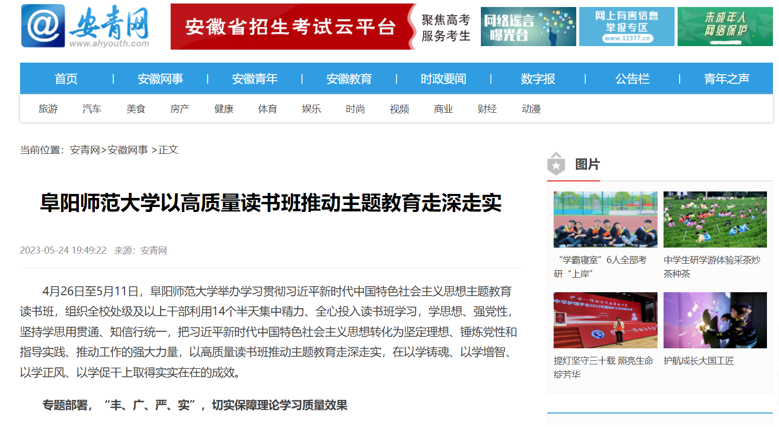 5月24日,安青网报道:阜阳师范大学以高质量读书班推动主题教育走深走实。文章地址: