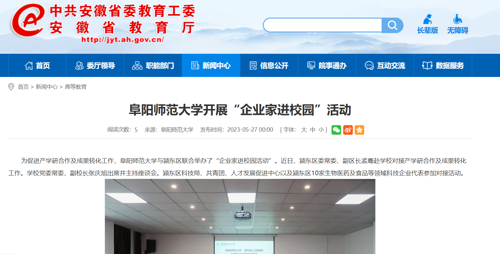 5月27日,安徽教育网报道:阜阳师范大学开展“企业家进校园”活动。文章地址: