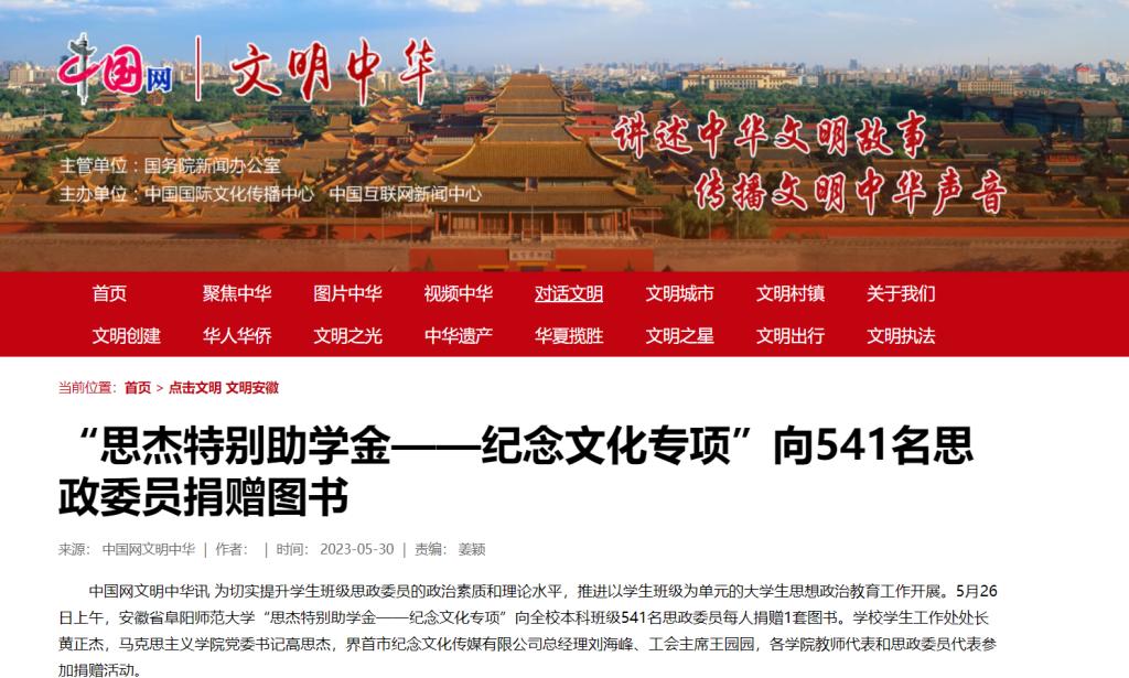 5月30日,中国网报道:“思杰特别助学金——纪念文化专项”向541名思政委员捐赠图书。文章地址:http://wmzh.china.com.cn/2023-05/30/content_42389482.htm