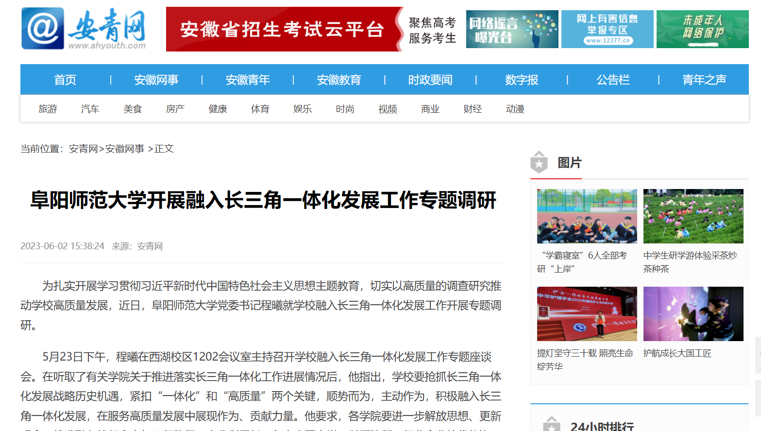 6月02日,安青网报道:阜阳师范大学开展融入长三角一体化发展工作专题调研。文章地址: