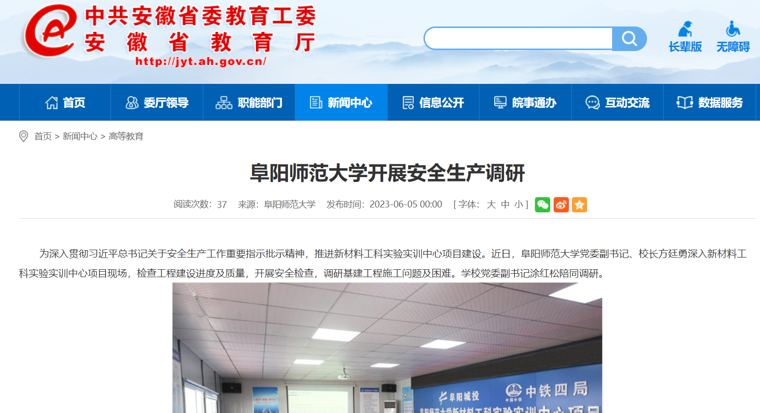 6月05日,安徽教育网报道:阜阳师范大学开展安全生产调研。文章地址: