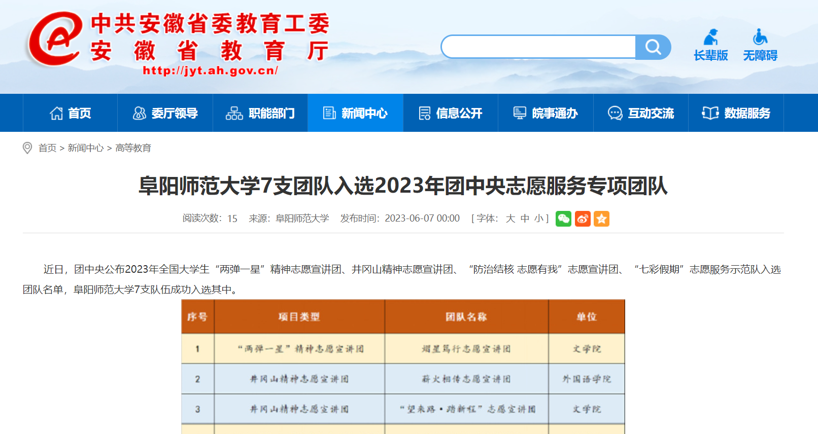 安徽教育网报道:阜阳师范大学7支团队入选2023年团中央志愿服务专项团队