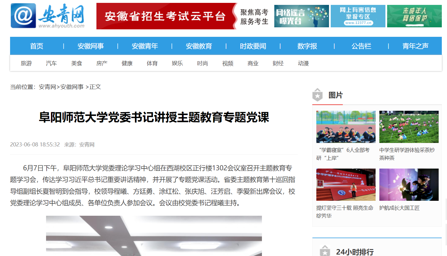 6月08日,安青网报道:阜阳师范大学党委书记讲授主题教育专题党课。文章地址:
