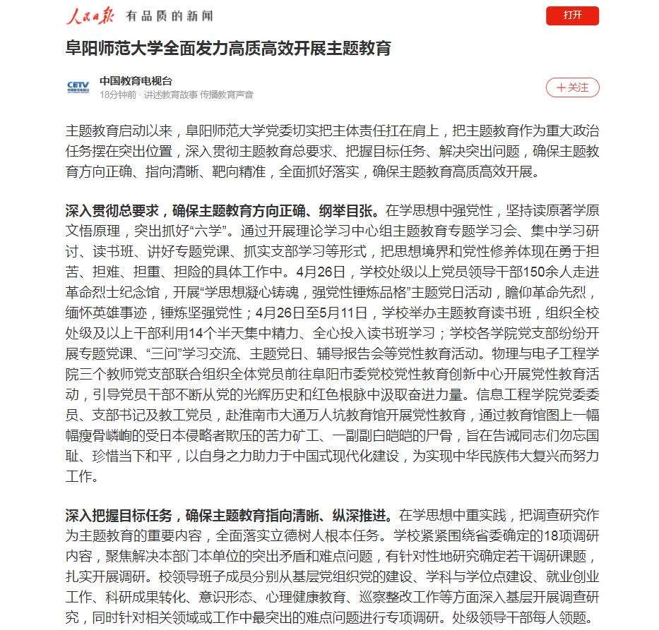 人民日报客户端报道:阜阳师范大学全面发力高质高效开展主题教育