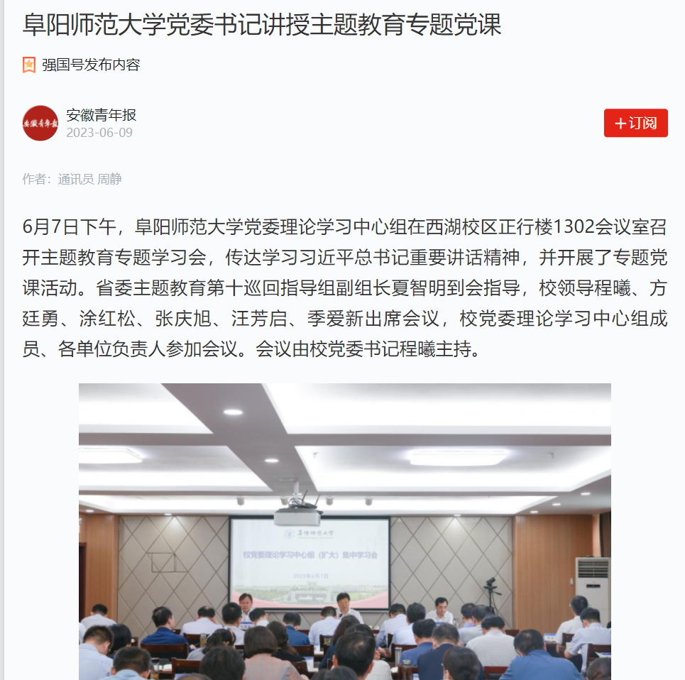 6月09日,“学习强国”安徽青年报平台报道:阜阳师范大学党委书记讲授主题教育专题党课。文章地址:https://article.xuexi.cn/articles/index.html?art_id=15638787904936241250&source=share&study_style_id=feeds_opaque&reco_id=10237edfd0fdc0a8857f000s&share_to=wx_single&study_share_enable=1&study_comment_disable=0&ptype=0&item_id=15638787904936241250
