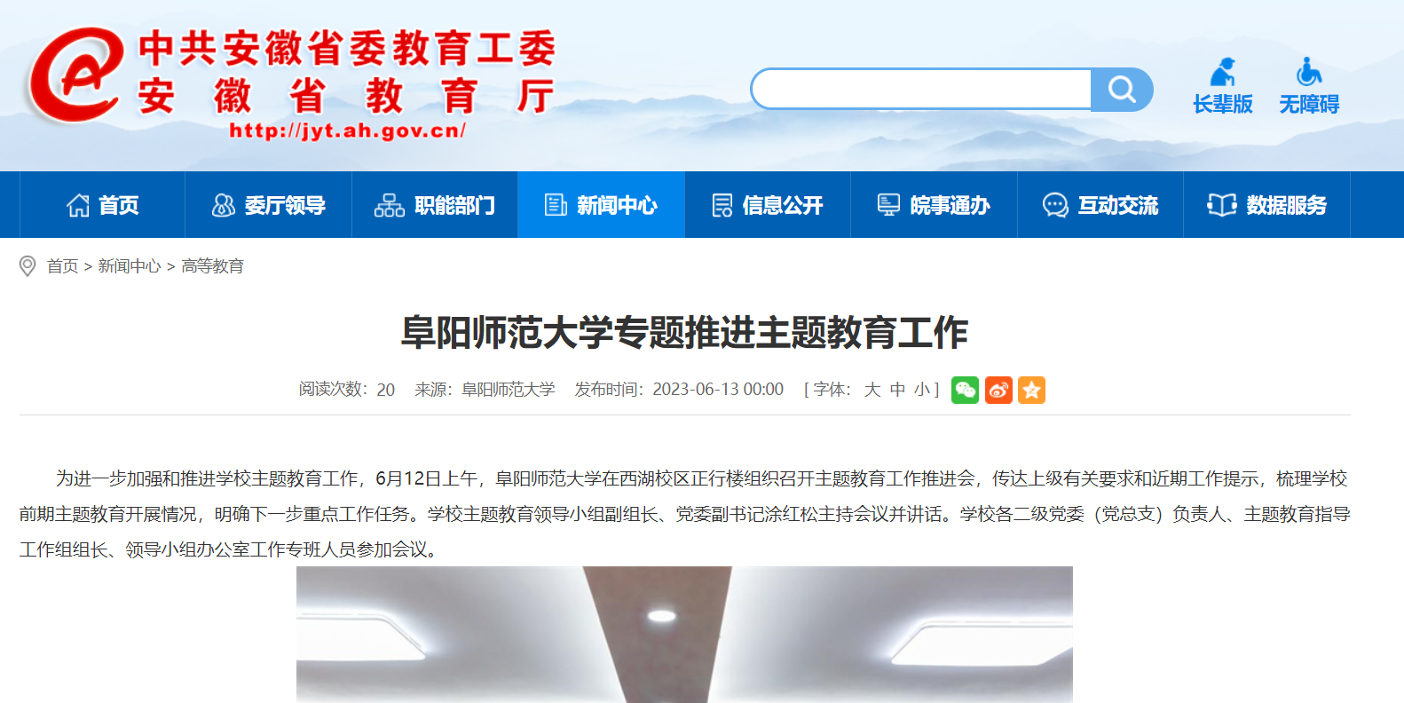 6月13日,安徽教育网报道:阜阳师范大学专题推进主题教育工作。文章地址: