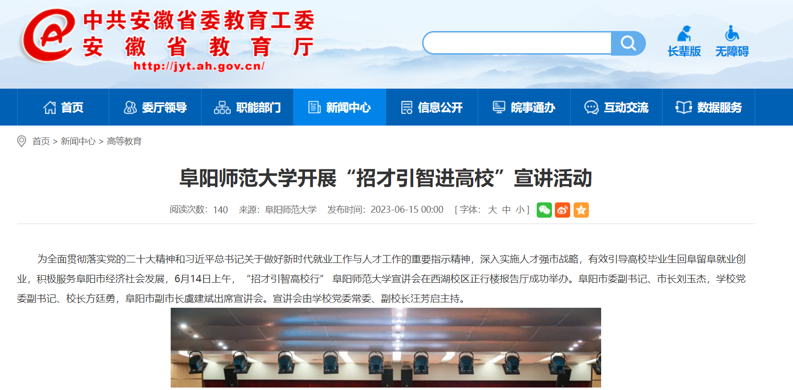 6月15日,安徽教育网报道:阜阳师范大学开展“招才引智进高校”宣讲活动。文章地址: