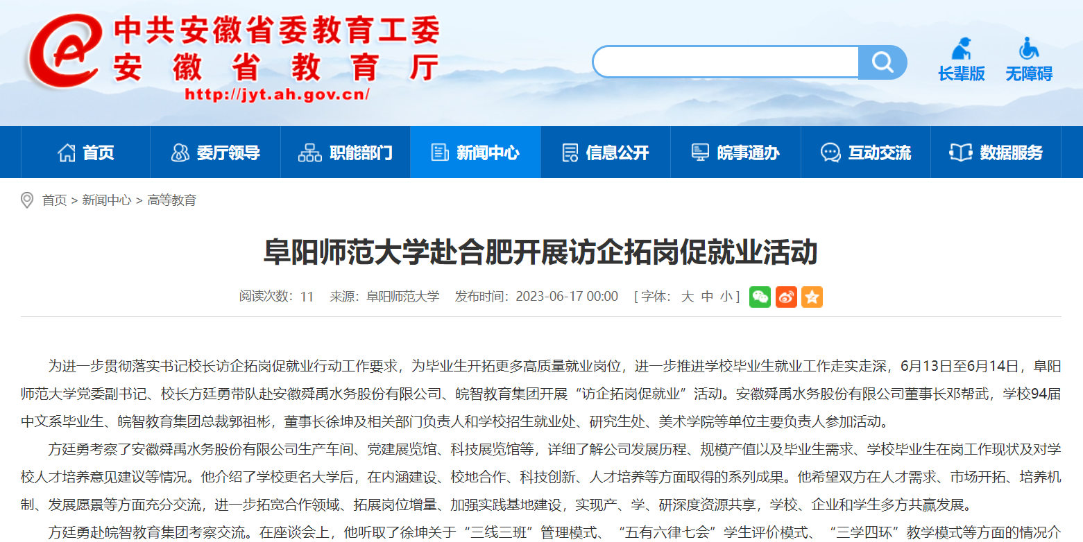 6月17日,安徽教育网报道:阜阳师范大学赴合肥开展访企拓岗促就业活动。文章地址: