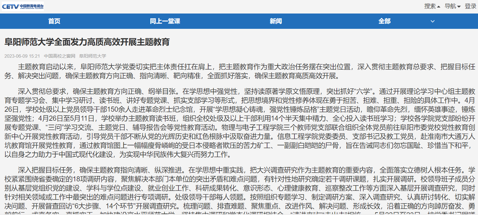 6月9日,中国教育电视台官网报道:阜阳师范大学全面发力高质高效开展主题教育。文章地址:
