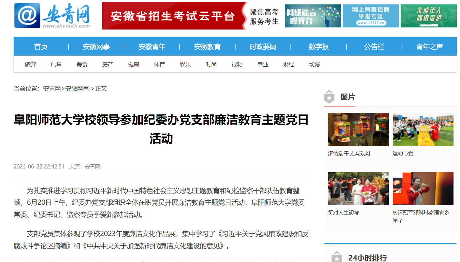6月22日,安青网报道:阜阳师范大学校领导参加纪委办党支部廉洁教育主题党日活动。文章地址: