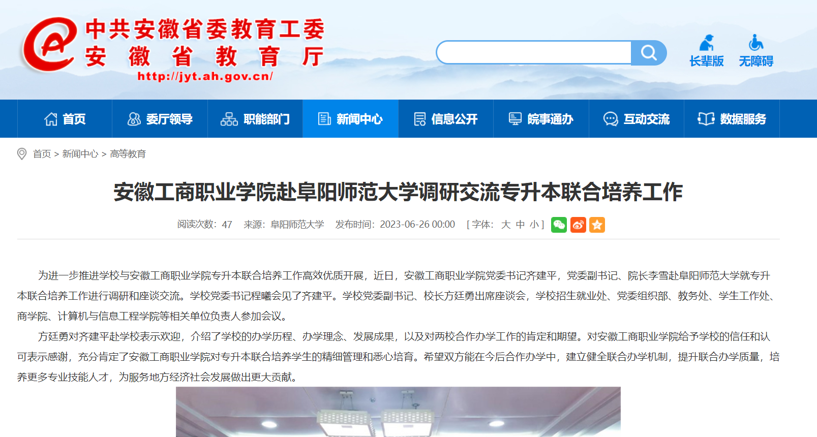 6月26日,安徽教育网报道:安徽工商职业学院赴阜阳师范大学调研交流专升本联合培养工作。文章地址: