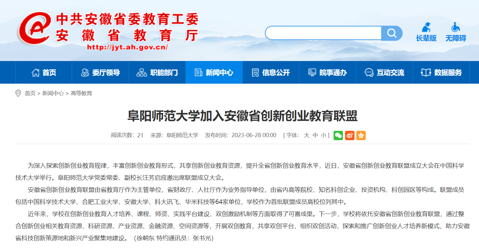6月28日,安徽教育网报道:阜阳师范大学加入安徽省创新创业教育联盟。文章地址: