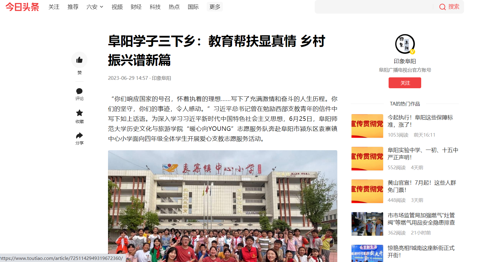 6月29日,今日头条报道:阜阳学子三下乡:教育帮扶显真情 乡村振兴谱新篇。文章地址:https://www.toutiao.com/article/7249997884211577401/?app=news_article×tamp=1688022170&use_new_style=1&req_id=202306291502509D5C6E9D85B6B0593268&group_id=7249997884211577401&wxshare_count=1&tt_from=weixin&utm_source=weixin&utm_medium=toutiao_android&utm_campaign=client_share&share_token=5d8f73cd-1765-49ec-b7c6-90c8c664d586&source=m_redirect
