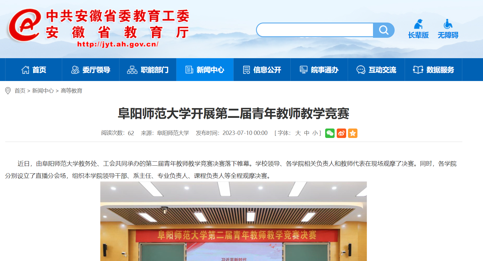 7月10日,安徽教育网报道:阜阳师范大学开展第二届青年教师教学竞赛。文章地址: