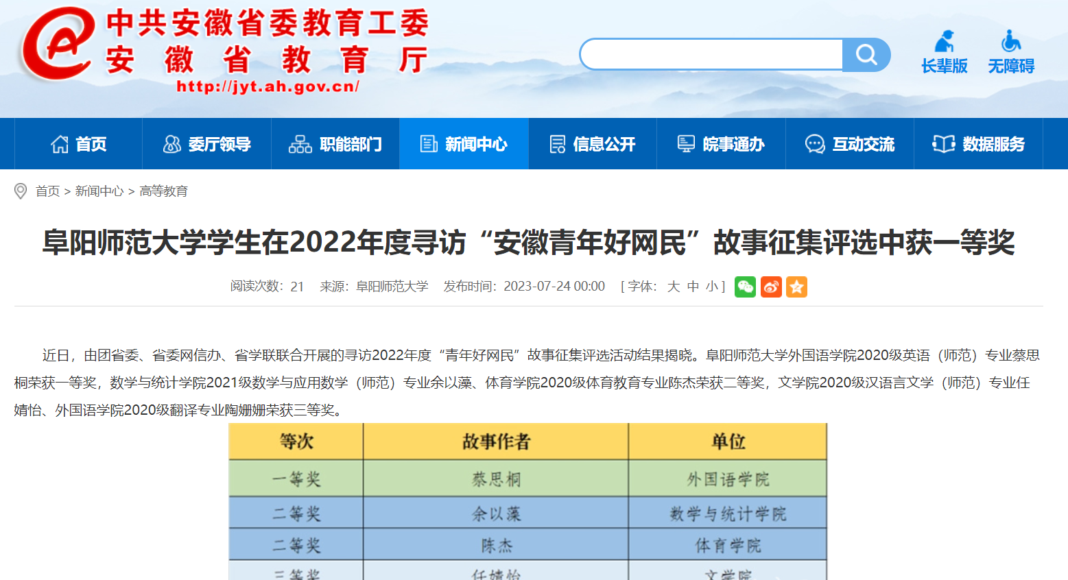 7月24日,安徽教育网报道:阜阳师范大学学生在2022年度寻访“安徽青年好网民”故事征集评选中获一等奖。文章地址:http://jyt.ah.gov.cn/xwzx/gdjy/40662924.html
