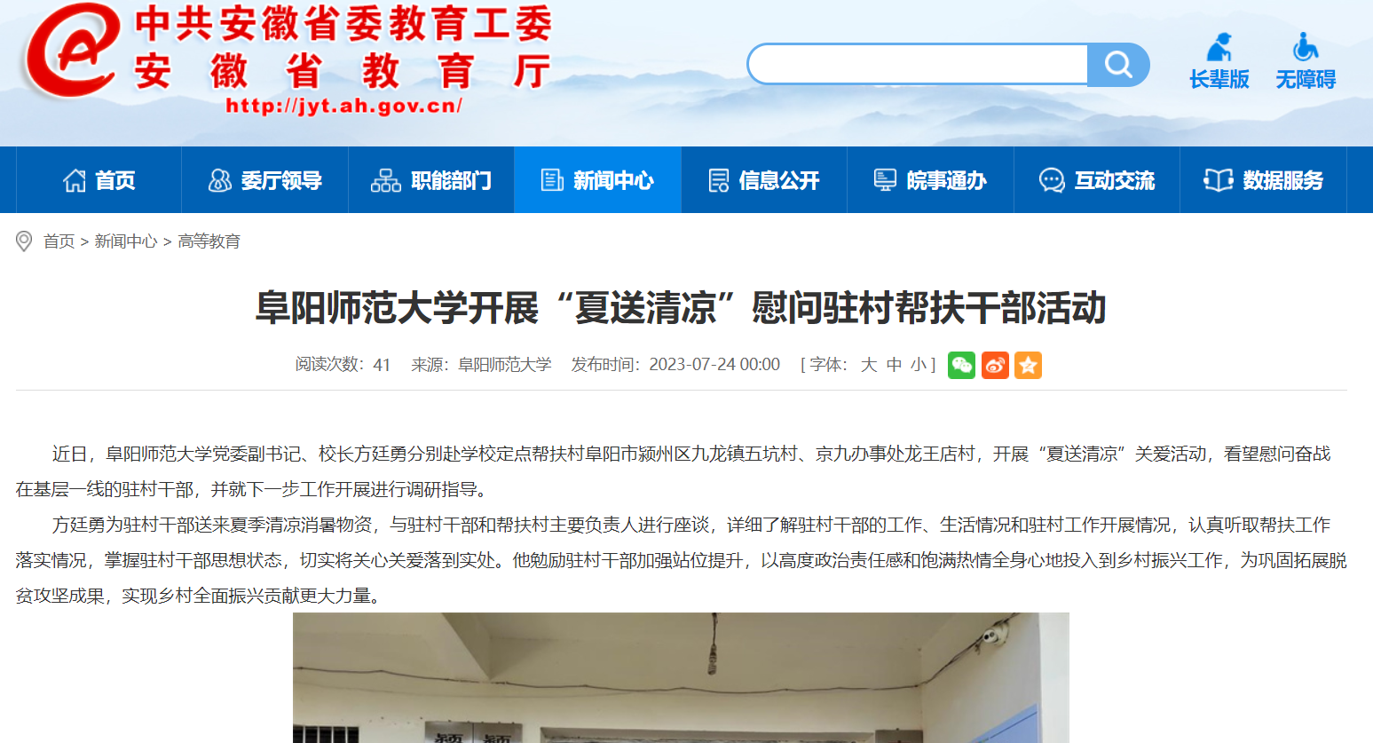 7月24日,安徽教育网报道:阜阳师范大学开展“夏送清凉”慰问驻村帮扶干部活动。文章地址: