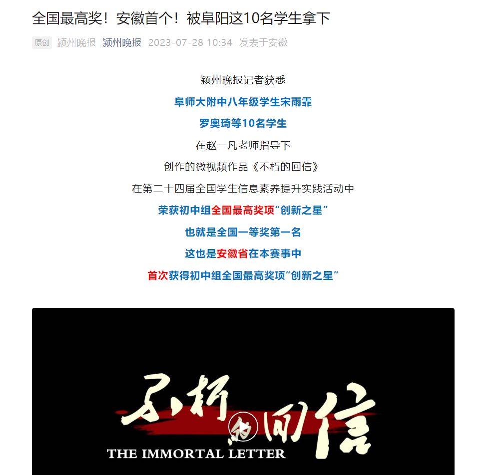 7月28日,颍州晚报报道:全国最高奖!安徽首个!被阜阳这10名学生拿下。文章地址: