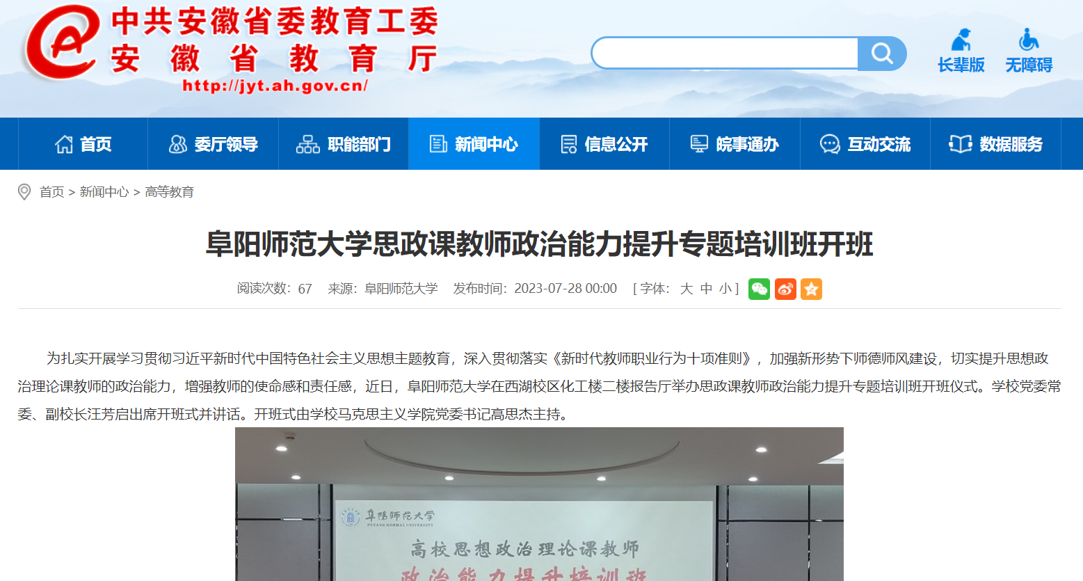 7月28日,安徽教育网报道:阜阳师范大学思政课教师政治能力提升专题培训班开班。文章地址: