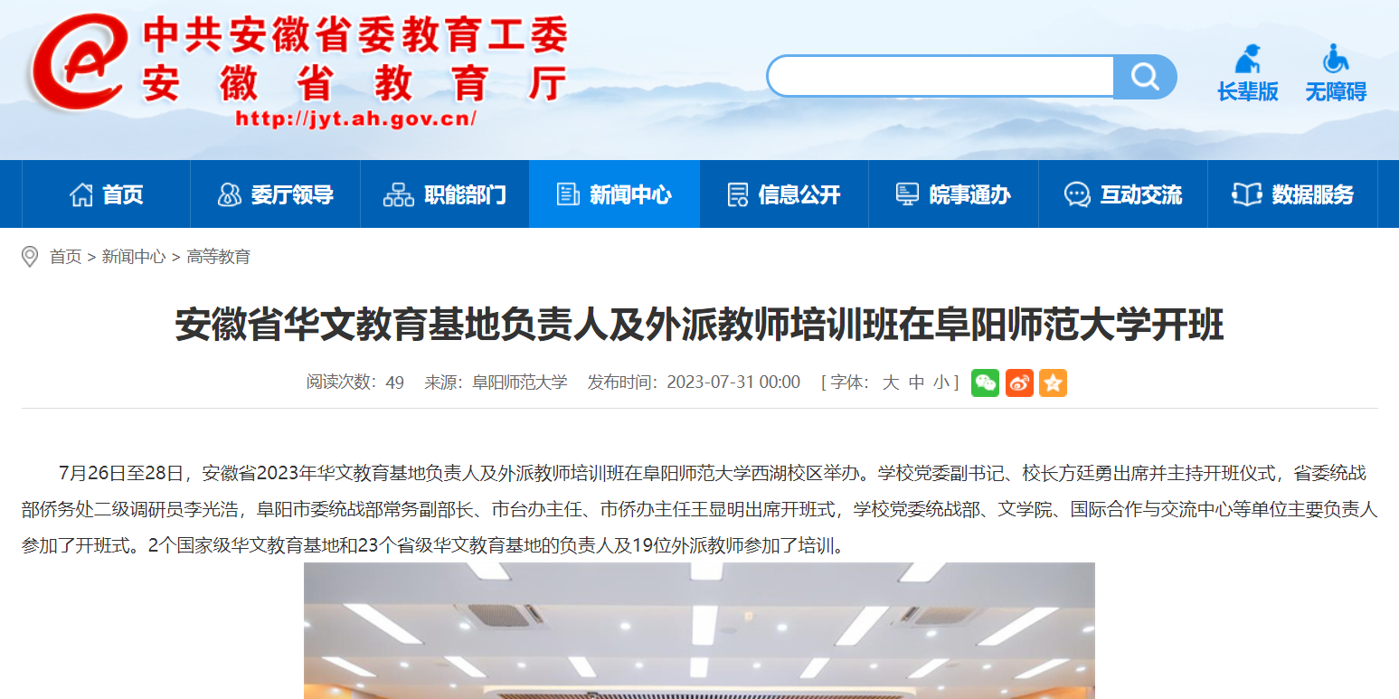 7月31日,安徽教育网报道:安徽省华文教育基地负责人及外派教师培训班在阜阳师范大学开班。文章地址: